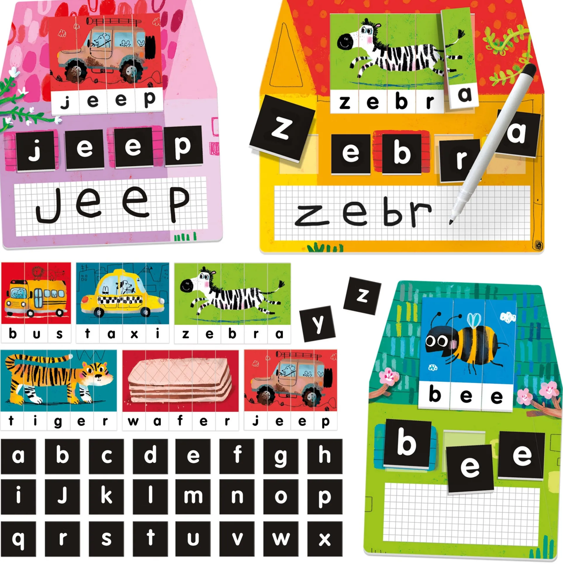 Builds words in playful houses